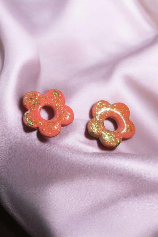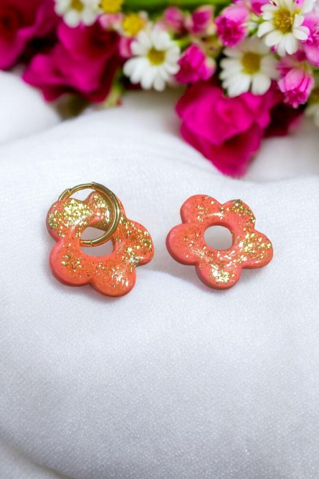 Ajoutez une touche d’originalité et d’éclat à vos tenues avec ces pampilles artisanales en forme de petite fleur. Réalisées à la main en pâte polymère orange clair, elles sont sublimées par de délicats éclats de feuille dorée qui reflètent la lumière avec élégance. Leur finition brillante met en valeur leur design pétillant et moderne.