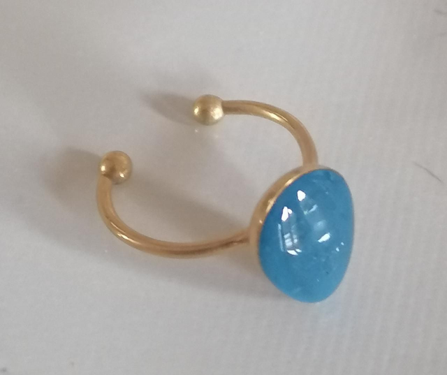 Apportez une touche d’élégance artisanale à votre tenue avec cette bague extensible dorée en acier inoxydable hypoallergénique, ornée d’un délicat bijou en forme de goutte façonné à la main en pâte polymère et sublimé par une finition en résine UV brillante.