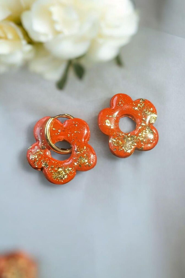 Ajoutez une touche d’originalité et d’éclat à vos tenues avec ces pampilles artisanales en forme de petite fleur. Réalisées à la main en pâte polymère orange vif, elles sont sublimées par de délicats éclats de feuille dorée qui reflètent la lumière avec élégance. Leur finition brillante met en valeur leur design pétillant et moderne.