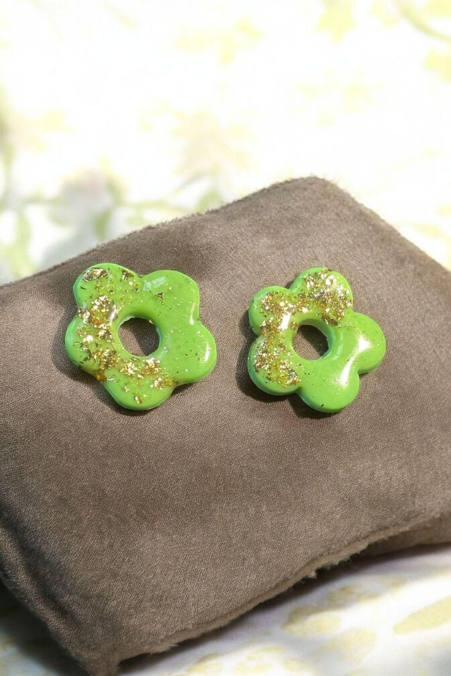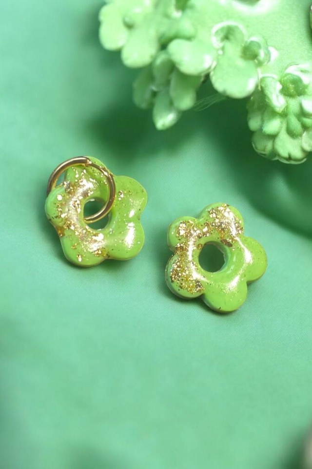Ajoutez une touche d’originalité et d’éclat à vos tenues avec ces pampilles artisanales en forme de petite fleur. Réalisées à la main en pâte polymère vert clair, elles sont sublimées par de délicats éclats de feuille dorée qui reflètent la lumière avec élégance. Leur finition brillante met en valeur leur design pétillant et moderne.